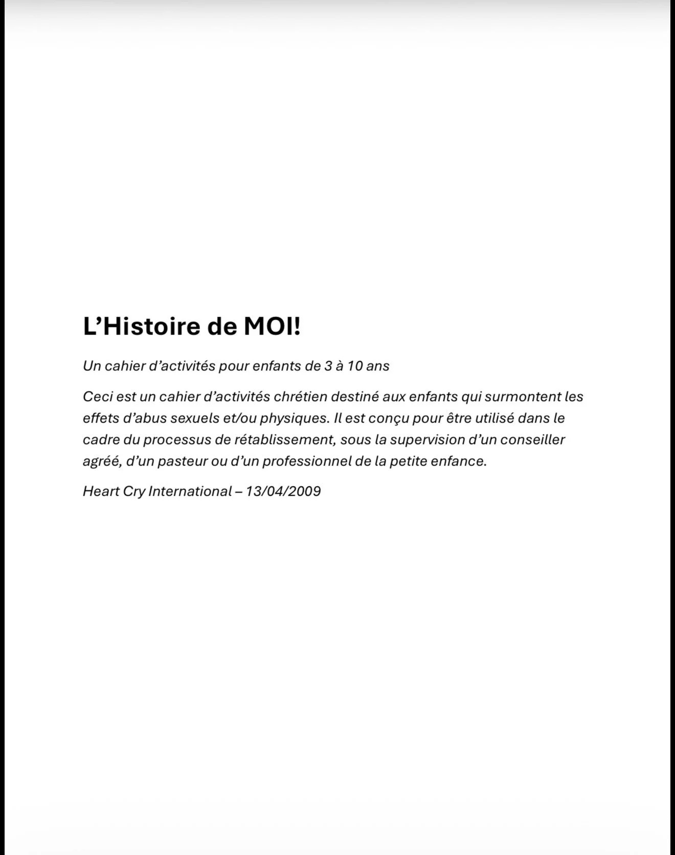 The Story of Me is an abuse prevention and recovery workbook for children. The first portion teaches children to value and protect their bodies. The second portion gives children an opportunity to tell their story if they have been abused in any way, providing a way for them to get the help they need and begin their healing process.